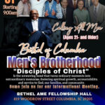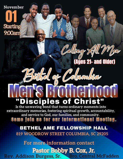 Calling All Men ages 21 and older to join the Bethel of Columbia Men’s Brotherhood. “Disciples of Christ” is the unwavering bond that turns ordinary moments into extraordinary memories, fostering spiritual growth, accountability, and service to God, our families, and community. Click and send a message to Pastor Bobby B. Cox Jr, Rev. Addison Burgess Sr, or Bro. Central McFadden