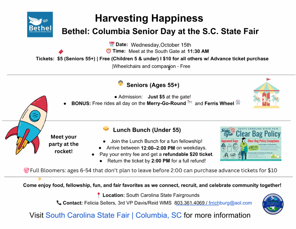 “Oh The Places You’ll Go” with B.L.A.S.T. – Bethel of Columbia’s children and youth ministry, which encompasses Church School, YPD, VBS, Outings, and so much more! Click and send a message to Sis. Lynn Hutto or Sis. Felecia Sellers for more information.